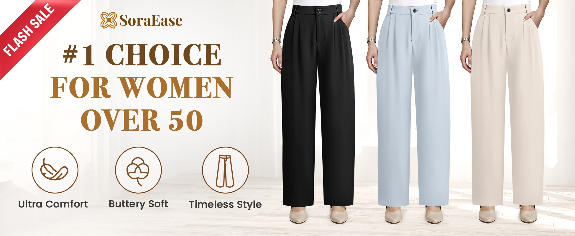Rediscover everyday elegance with SoraEase, the perfect pants designed to flatter mature women with effortless comfort and timeless style.